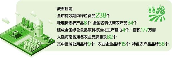 没有品牌,就没有身价。截至目前,全市有效期内绿色食品238个、地理标志农产品8个、全国名特优新农产品34个,建成全国绿色食品原料标准化生产基地4个,面积177万亩;入选河南省知名农业品牌目录82个,其中区域公用品牌9个、农业企业品牌15个、特色农产品品牌58个。