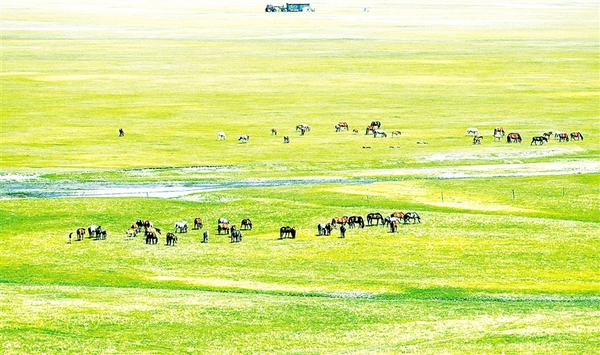 7月1日,马群在河畔的草原上觅食。