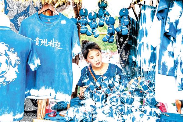7月1日,少数民族摊主在贵州“村超”足球赛场旁设置的文创摊位整理文创饰品。