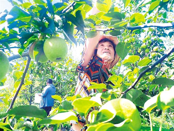 7月7日,淮阳区白楼镇大郝村村民张艳梅在自家果园采摘酥梨。她家的果园有20亩,今年仅此一项可收入10多万元。据介绍,大郝村目前共种植蟠桃、黄金蜜一号、酥梨、葡萄等180余亩,农民经济收入可观。记者 沈湛 摄