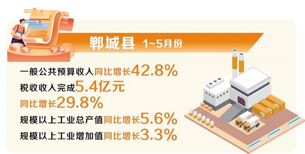 项目建设是经济社会发展的强大动力。该县1-5月一般公共预算收入同比增长42.8%;税收收入完成5.4亿元,同比增长29.8%;规模以上工业总产值同比增长5.6%;规模以上工业增加值同比增长3.3%。郸城县高质量发展动能强劲。①2