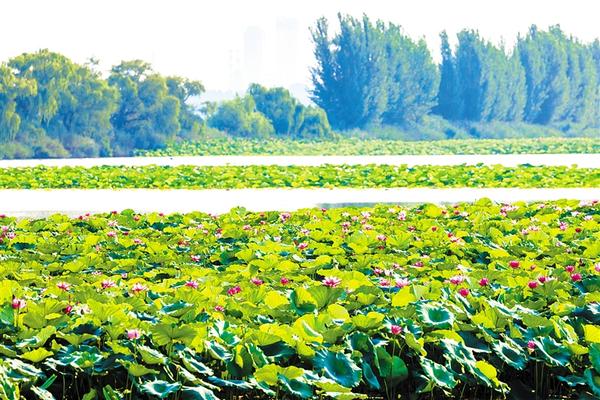 近日,山东省济南市章丘区白云湖国家湿地公园内万亩荷花盛开,让游客在炎炎夏日中感受水清岸绿、荷叶田田的生态美景。近年来,章丘区白云湖街道依托白云湖国家湿地公园建设,先后开展退渔还湿、湖库清淤、湖库联通、环湖大堤改造等生态提升工程,湿地生态系统和功能得到修复。 新华社记者 朱峥 摄
