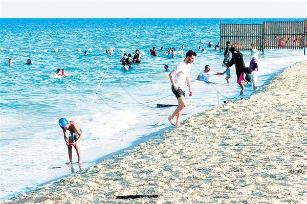 7月7日,在卡塔尔多哈,人们在海边消暑。