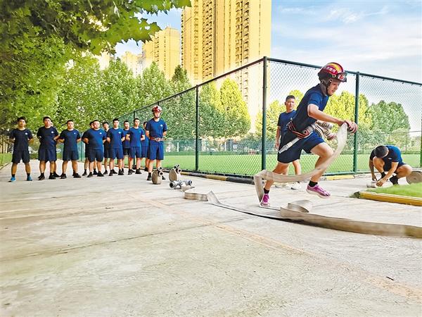 近日,市城乡一体化示范区消防救援大队积极开展执勤岗位大练兵活动,训练科目包括3000米跑、60米肩梯跑、100米负重跑、一人三盘水带连接、4楼绳索攀爬等。图为活动现场。 姬慧洋 摄