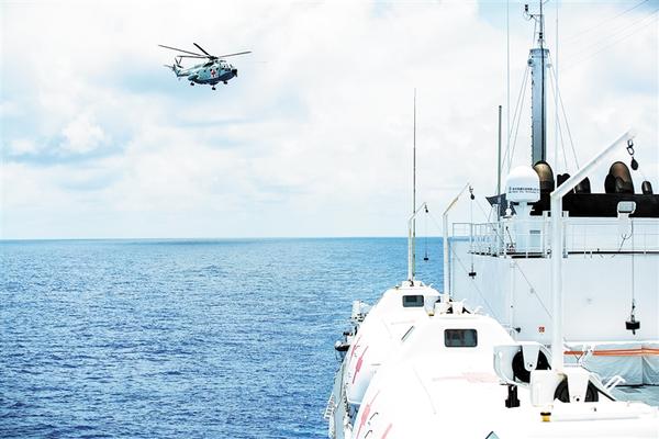 7月10日,中国海军“和平方舟”号医院船在太平洋上组织反恐反海盗演练。这是舰载直升机前出查证。 黎宇 摄(新华社发)