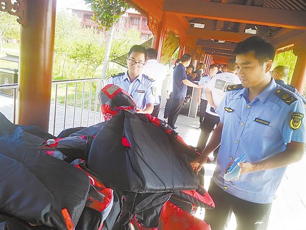 7月11日,淮阳区安委办组织工作人员到龙湖景区运营管理公司、游船北码头等地,检查第二届周口荷花节期间安全生产、值班值守、应急处置等工作。图为工作人员在游船北码头检查救援队伍预置、应急装备储备等情况。记者 王凯 摄