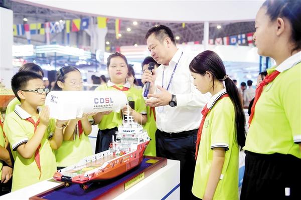 7月12日,小学生在航海科技博览会上参观LNG清洁能源动力的船舶模型。航海科技博览会作为2023年中国航海日活动周重要内容之一,于7月10日至13日在河北沧州举办。新华社记者 王民 摄