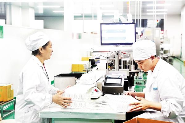 近年来,周口市按照“一县一特”原则,不断壮大临港经济发展格局。项城市紧跟国际生物医药产业发展方向,依托项城港天然优势,重点打造生物医药基地,力争“十四五”末建成年产值150亿元的医药产业集群。作为项城市生物医药产业龙头,乐普药业已连续多年位居周口市工业企业纳税第一名,先后被授予“国家高新技术企业”“河南省制造业头雁企业”“河南省‘瞪羚’企业”称号。图为乐普药业股份有限公司生产车间内,工人们正在对产品进行检测。