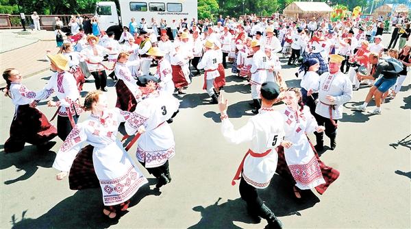 7月15日,在白俄罗斯维捷布斯克,参赛者展示舞蹈。