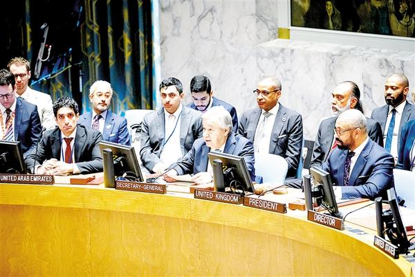 7月18日,联合国秘书长古特雷斯(前右二)在纽约联合国总部出席联合国安理会人工智能与安全问题高级别公开会时发言。
