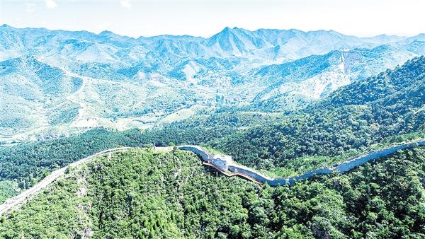 河北省迁安市境内的白羊峪长城(7月23日摄,无人机照片)。 夏日里,河北省迁安市境内的白羊峪长城沿线树木葱郁,盘踞在山巅的古长城在蓝天白云的映衬下愈发壮美。 新华社记者 牟宇 摄