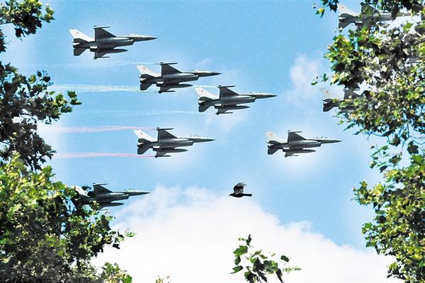 大图为在比利时布鲁塞尔,多架F-16战机参加国庆日阅兵式。小图为军人在比利时布鲁塞尔参加国庆日阅兵式。