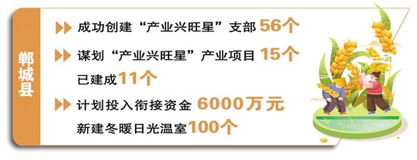 目前,该县已成功创建“产业兴旺星”支部56个,其中“五星”4个、“四星”29个、“三星”23个。今年计划投入3780万元,年底计划再创建“产业兴旺星”支部67个。谋划“产业兴旺星”产业项目15个,已建成11个,其他4个正在建设;计划投入衔接资金6000万元,新建冬暖日光温室100个,预计9月底完工;发挥“唐桥鸭蛋”非物质文化遗产品牌,新建青年鸭养殖基地6个,养殖青年鸭100万只;发挥传统种植优势,规模化种植黑皮冬瓜和辣椒等20万亩;因地制宜发展生态旅游、休闲采摘、农家乐等近郊农业产业,形成了宁平葡萄园和草莓园、胡集车厘子园、钱店葡萄园、汲冢花卉园、城郊果蔬种植基地等休闲农业。