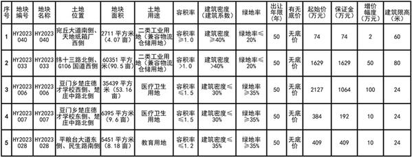一、拍卖地块的基本情况和规划指标要求: (详见下表)1.HY2023040号宗地为工业用地“标准地”出让,“标准地”控制性指标为:入驻的具体产业类型为橡胶和塑料制品业,投资强度不低于260万元/亩,亩均税收不低于6万元/亩,具体由周口先进制造业开发区管委会负责监督监管。竞得者需与周口先进制造业开发区管委会签订《工业用地“标准地”履约监管协议》,并出具《“标准地”企业信用承诺书》;行政办公和生活服务设施用地占地面积不得超过总用地面积的7%,建筑面积不得超过总建筑面积的15%,严禁建造成套住宅、宾馆、专家楼和培训中心等非生产性配套设施。土地出让合同签订后,12个月内必须开工建设,工期35个月,土地成交价款需在土地出让合同签订后60日内交清,交地时间6个月内。2.HY2023033号宗地为工业用地“标准地”出让,“标准地”控制性指标为:入驻的具体产业类型为食品制造业,投资强度不低于260万元/亩,亩均税收不低于6万元/亩,具体由周口先进制造业开发区管委会负责监督监管。竞得者需与周口先进制造业开发区管委会签订《工业用地“标准地”履约监管协议》,并出具《“标准地”企业信用承诺书》;行政办公和生活服务设施用地占地面积不得超过总用地面积的7%,建筑面积不得超过总建筑面积的15%,严禁建造成套住宅、宾馆、专家楼和培训中心等非生产性配套设施。土地出让合同签订后,12个月内必须开工建设,工期35个月,土地成交价款需在土地出让合同签订后60日内交清,交地时间6个月内。3.根据周口市淮阳区国土空间规划委员会2023年度第七次会议研究的意见和周口市淮阳区财政局出具的HY2023007号宗地上资产作价处置函,地上资产与土地一起捆绑出让,竞得人需另支付地上资产价款2265327元,收款单位:周口市淮阳区财政局非税收入专户,开户银行:中原银行淮阳区支行,账号:411623010170005701,地上资产无规划、建设手续,具体明细详情另询。4.根据周口市淮阳区国土空间规划委员会2023年度第七次会议研究的意见和周口市淮阳区财政局出具的HY2023028号宗地上资产作价处置函,地上资产与土地一起捆绑出让,竞得人需另支付地上资产价款4612711元,收款单位:周口市淮阳区财政局非税收入专户,开户银行:中原银行淮阳区支行,账号:411623010170005701,地上资产无规划、建设手续,具体明细详情另询。5.具体建设方案须报规划部门批准后实施。6.根据淮政【2019】45号文件精神,竞得人摘牌土地后,应将项目施工标发包给在淮阳设立公司的施工单位;房地产开发项目非淮阳境内企业竞买人在竞买申请时,申请书中应明确成立新公司、公司出资构成及成立时间。7.土地竞买保证金必须以竞买申请人(单位)自身的名义交纳,竞买申请人(单位)与交款人(单位)名称不一致的,无法确认其竞买资格,交纳款项无效。8.具体以规划部门出具的规划指标为准,详见规划设计条件或批复文件。