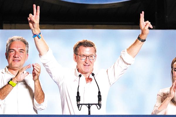 7月24日,在西班牙马德里,人民党主席阿尔韦托·努涅斯·费霍与支持者互动。 西班牙内政部24日凌晨公布的初步计票结果显示,在23日举行的西班牙议会选举中,右翼政党人民党成为议会第一大党,但没有获得单独组建政府所需绝对多数席位。 新华社记者 孟鼎博 摄