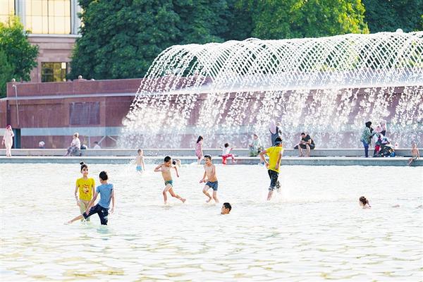 7月23日,在乌兹别克斯坦首都塔什干,人们在水中避暑消夏。