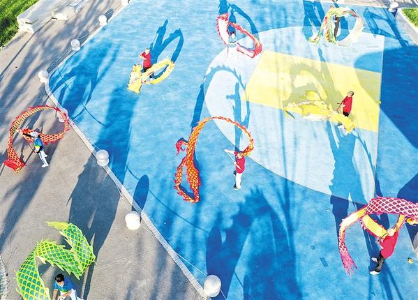 7月25日,市民在白沟新城一处“口袋公园”舞龙(无人机照片)。