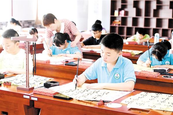 7月25日,孩子们在合肥市肥西县紫蓬镇中心学校少年宫练习书法。