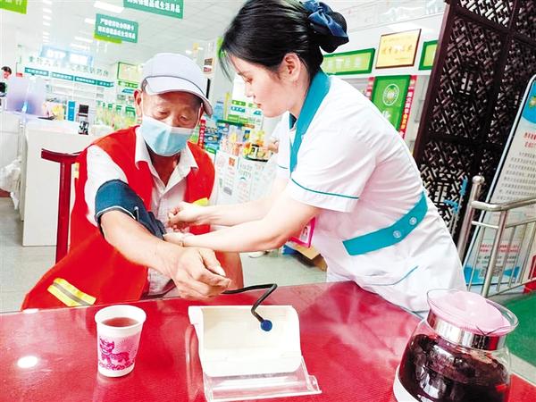 近日,西华县市场监督管理局联合城区25家药店,为户外工作者设立“爱心驿站”,义务为交警、环卫工人、快递员等提供服务。图为药店工作人员为环卫工人量血压。 记者 张猛 摄