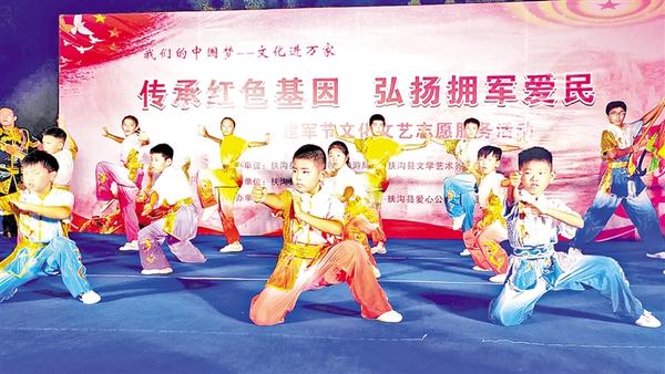 7月27日晚,扶沟县文旅局、县文联、县文化馆在县人民公园联合举办庆祝“八一”建军节文化志愿者服务活动。图为孩子们在表演节目。 记者 金月全 通讯员 许伯景 摄