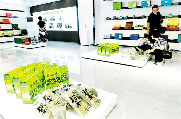 近日,鹿邑县省级现代农业产业园产品展示厅内,蒲公英面条、蒲公英茶、蒲公英粉条等系列产品吸引了参观者的眼球。鹿邑县省级现代农业产业园是以蒲公英产业为主,白术、芍药、金银花等中药材产业为辅,打造的全产业链条园区,总占地1100 亩,建有蒲公英育种温室、蒲公英标准化种植基地、蒲公英加工园、综合服务等项目。园区共有加工生产线4条,年总产值3亿多元,带动脱贫户户均增收6000余元。②15记者 王映 摄
