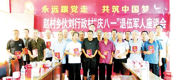 8月1日上午,鹿邑县赵村乡伙刘行政村举行庆“八一”退伍军人座谈会,感谢大家一直以来对村“两委”工作的支持,号召大家弘扬优良传统,永葆军人本色,积极投身新农村建设。