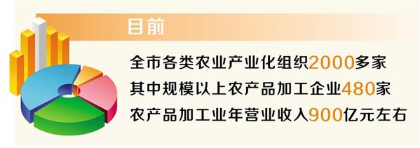 近年来,我市聚焦农村优势特色产业,强化创新引领,进一步延伸产业链、提升价值链、打造供应链、拓宽增收链,积极引领乡村产业转型升级和高质量发展。目前,全市各类农业产业化组织2000多家,其中规模以上农产品加工企业480家,农产品加工业年营业收入900亿元左右。全市省级农业产业化联合体25家,参与联合体的各类农业产业化组织300多家,年营业收入260亿元左右,辐射带动农户约30万户。全市积极开展“一村一品”村镇创建,截至目前,我市国家“一村一品”示范村镇11个、省级“一村一品”示范村镇7个。