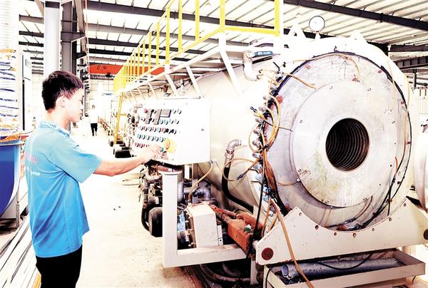 近年来,郸城持续优化营商环境,吸引不少浙商来郸投资建厂。其中,PE管生产企业河南公驰塑胶公司已成为郸城的特色企业之一。图为7月30日,河南公驰塑胶公司生产车间一角。记者 徐松 摄