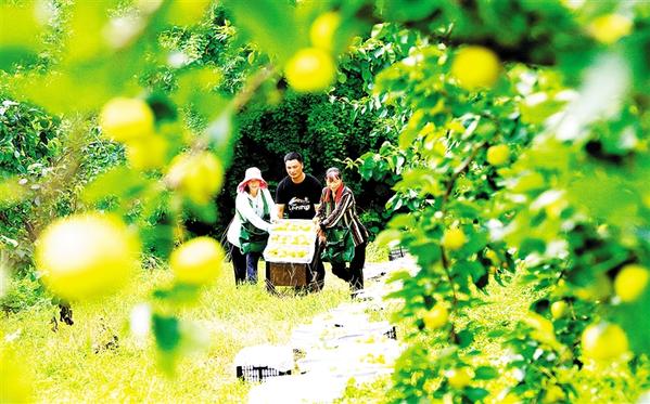 8月7日,在河南省驻马店市驿城区水屯镇源晟梨园种植基地,村民在搬运新鲜采摘的黄金梨。立秋将至,各地农民抢抓农时,开展农事活动。