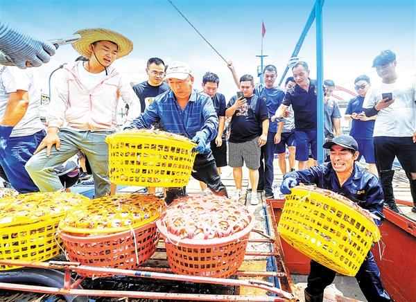 8月7日首批开渔归来的渔运船靠泊在舟山普陀沈家门舟山国际水产城码头,渔民把整筐的梭子蟹运送上岸。新华社记者 徐昱 摄