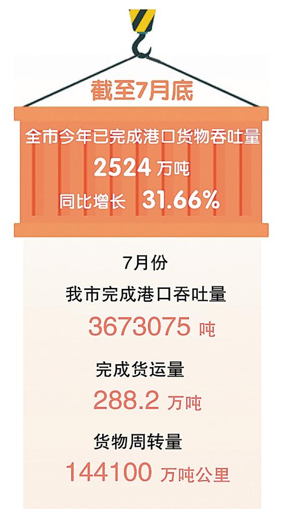 据统计,7月份我市完成港口吞吐量3673075吨,其中进港1424724吨、出港2248351吨,完成货运量288.2万吨,货物周转量144100万吨公里。截至7月底,全市今年已完成港口货物吞吐量2524万吨,同比增长 31.66%。