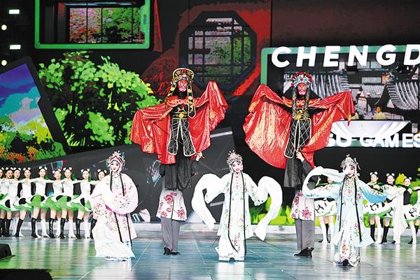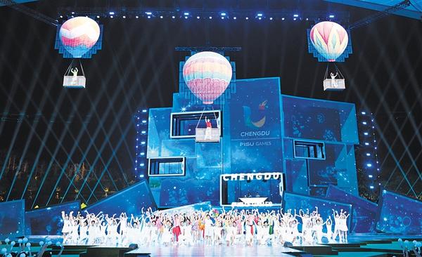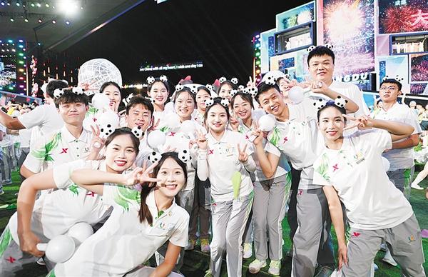 8月8日晚,第31届世界大学生夏季运动会闭幕式在成都露天音乐公园举行。图①图②为演员在闭幕式上表演。图③为志愿者在闭幕式上合影。
