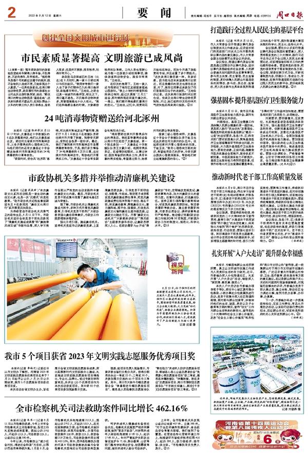 “前段时间,受台风‘杜苏芮’影响,河北涿州等地发生严重汛情,我们于8月1日派出6名救援队员前往涿州市开展了救援,转移受灾群众,受到社会各界一致好评。最近,我们了解到涿州市和高碑店市急需消毒液等物资,于是,我们多方筹备了24吨消毒液和6万只口罩,运往涿州市和高碑店市,帮助他们开展消杀工作。”太康县红十字会常务副会长焦阳光介绍。