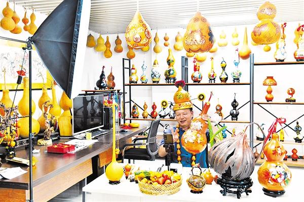 8月10日,在枣庄市薛城区葫芦刻绘非遗工坊,“周氏葫芦刻绘”非遗传承人周建华在直播推介葫芦刻绘作品。