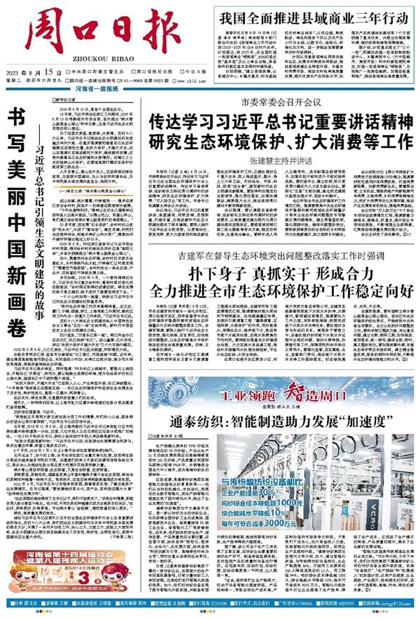 本报讯 (记者 王艳) 8月14日,市委常委会召开会议,传达学习习近平总书记在全国生态环境保护大会上的重要讲话精神,传达学习省委常委、组织部长王刚在周口调研时的讲话精神,研究生态环境保护、扩大消费、“万人助万企”等工作。市委书记张建慧主持会议并讲话。