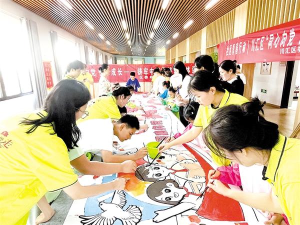 为深入贯彻落实党的二十大精神,引导少年儿童自觉增强铸牢中华民族共同体意识,近日,区委统战部、区民宗局携手团区委到小桥街道办事处高庄社区青年之家开展“同心向党 快乐成长”共绘一幅画主题教育活动,让爱国爱党的种子在少年儿童心中扎根发芽。图为活动现场。记者 韩志刚 通讯员 宋蕊茜 王露冰 摄
