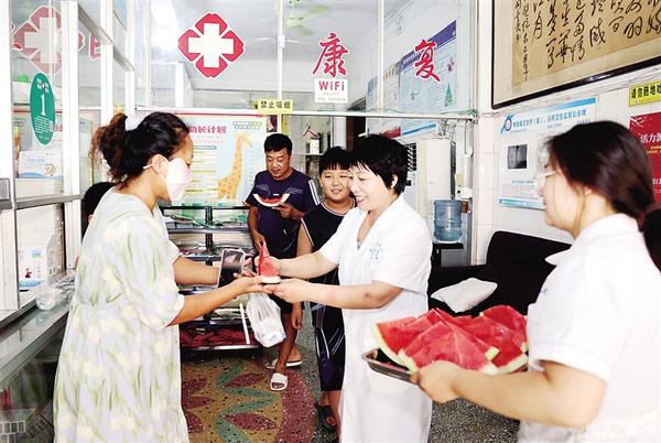 “这咋吃完呀?送给大家吃吧。”看着堆满诊所储藏室的西瓜,卢加莹、李春梅这才发了愁。于是,李春梅先在家族的微信群里发一条消息,随后转到了“育新社区平安建设群”“亲情群”。一时间,西关诊所成了免费领西瓜的“爱心驿站”(如图),邻居纷纷点赞。