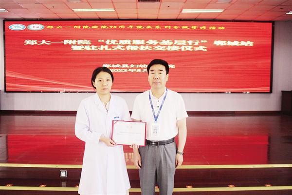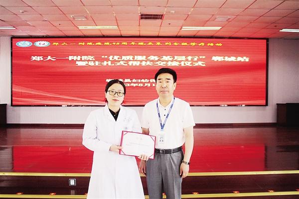 本报讯 (记者 徐松 通讯员 刘珂言 王鸿飞 文/图) 8月12日,郑大一附院“优质服务基层行”郸城站暨驻扎式帮扶交接仪式,在郸城县第四医健集团县妇幼保健院举行。郑大一附院介入科主任医师李臻教授,郸城县卫健委副科级干部王晓琳,郸城县妇幼保健院院长亢国良等领导班子成员参加,亢国良为郑大一附院内科专家刘爱勤、放射科专家王晓艳颁发聘任证书(如图)。