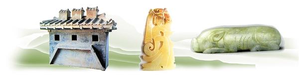 玉舞人,和田玉质,有褐色沁,保存完整,作舞蹈状,形象生动逼真,是一件艺术珍品。其他玉器有玉猪、玉璜、玉觿、玉饰等。