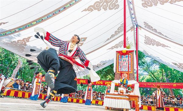 8月19日,在拉萨市罗布林卡园林内,贡嘎县乃萨藏戏队在表演藏戏《朗萨雯崩》。 为庆祝雪顿佳节,8月16日至8月22日期间,拉萨市在罗布林卡园林举行藏戏汇演,吸引市民和游人前来欣赏。 丁增尼达 摄(新华社发)