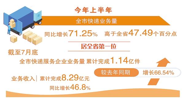 本报讯 (记者 沈铎) 邮政快递业联系千家万户、连通线上线下,既是畅通生产与消费的重要渠道,也是观察经济发展的一扇窗口。记者近日从市邮政管理局了解到,今年上半年,全市快递业务量同比增长71.25%,高于全省47.49个百分点,居全省第1位。截至7月底,全市快递服务企业业务量累计完成1.14亿件,较去年同期增长66.54%;业务收入累计完成8.29亿元,同比增长46.8%。