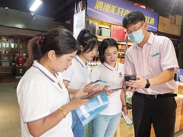 近日,农行周口分行积极开展存款保险宣传活动。该行工作人员走进社区、街道、企业,通过发放宣传折页、现场答疑解惑等方式,实现存款保险宣传与业务营销有机结合。图为农行周口莲花支行工作人员走进酒洲汇公司,向员工讲解存款保险知识。高翔 冯振涛 摄
