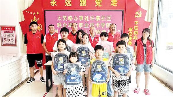 8月16日,太昊路办事处许寨社区联合周口职业技术学院开展关爱留守儿童志愿服务活动,为辖区留守儿童捐赠书包等学习用品。