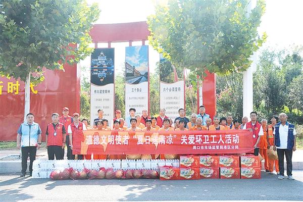 本报讯 (记者 宋风 通讯员 王燕 文/图) 为助力文明城市创建,8月17日上午,周口临港开发区市场监管部门组织道德文明使者和志愿者在临港开发区印象广场开展“夏日送清凉”关爱环卫工人活动。 活动现场,道德文明使者和党员志愿者将600多斤西瓜、20件矿泉水、20件藕粉等爱心物资送给辖区环卫工人(如图),让他们感受到炎炎夏日里的一片清凉,衷心感谢他们为城市的整洁和美丽付出的辛勤劳动,叮嘱他们合理安排工作时间,注意防暑。