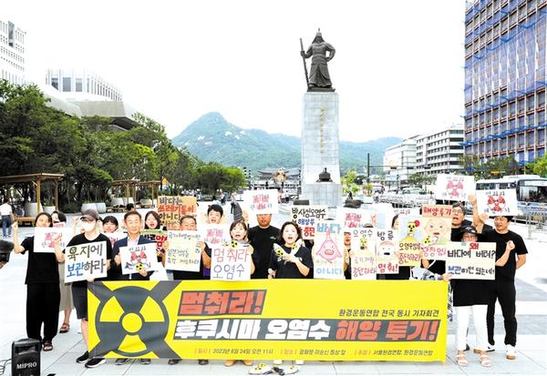 8月24日,韩国民间环保组织“环境运动联合”成员在首尔光化门广场集会,抗议日本核污染水排海。