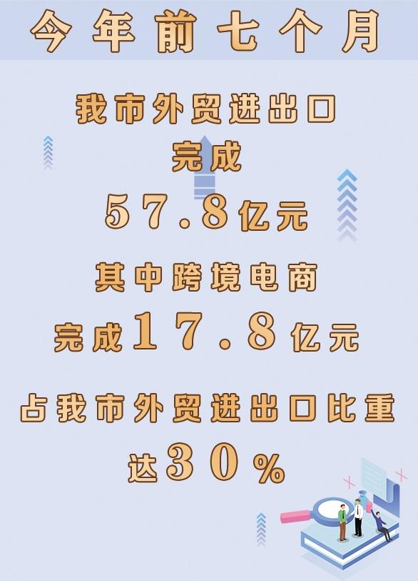本报讯 (记者 王永剑) 跨境电商在政策激励和环境影响下持续、快速、健康发展,已经成为我市外贸高质量发展的新动能、新亮点,转型升级的新载体、新抓手。8月23日,记者从市商务局获悉,今年前七个月,我市外贸进出口完成57.8亿元,其中跨境电商完成17.8亿元,占我市外贸进出口比重达30%。