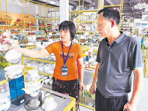昨日,在位于市区八一大道与漯阜铁路线交汇处附近的周口厨具市场一产品展示厅,营业员向顾客介绍新型陶瓷餐具。该市场建筑面积3万多平方米,入驻经销商40多家,产品种类3万多个,是豫东南最大的厨具市场。去年试营业以来,随着经济复苏,市场内车水马龙、人声鼎沸,各类厨具、餐具、灶具等产品销量持续增长,月交易额2000万元以上,成为我市民营经济发展的新亮点。记者 付永奇 摄