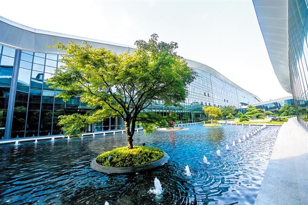 这是8月24日拍摄的杭州富阳水上运动中心的中庭花园,水池中的水来自于循环利用的雨水。