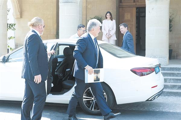 8月28日,联合国负责欧洲、中亚和美洲事务的助理秘书长米洛斯拉夫·延恰(前右)抵达塞浦路斯尼科西亚总统府。