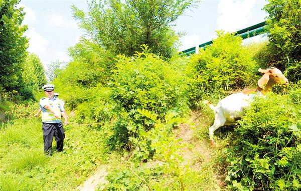 近日,周口市高速交警支队一大队民警在宁洛高速巡逻途中,发现高速公路边坡有村民在放羊,经过民警宣传教育,村民意识到了错误,积极配合民警将羊群赶离高速公路,消除了道路安全隐患。